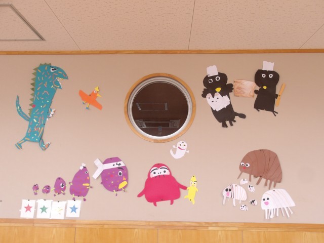 絵本の部屋の飾りはいろいろな絵本のキャラクターにしました。「私、ノンタン作るわ」「恐竜の足、むずかしいな。手伝って」と