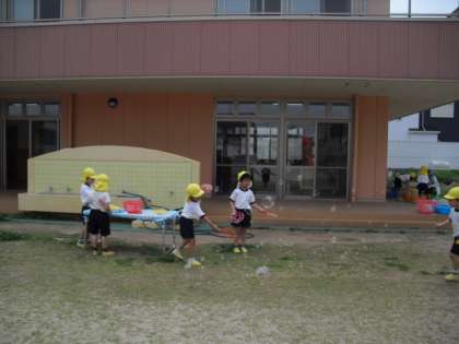 今日もみんなで元気いっぱい遊びました!園庭では、シャボン玉をしました。シャボン玉が風にのって飛んでいく様子を見て「わ〜、きれい〜」と嬉しそうにしていました。きりん組の子どもたちは、みんなでお世話をしているアゲハ蝶の幼虫に新しい葉っぱのご飯をあげていましたよ。片付けの後には、一緒にストップ玉入れも楽しみました!