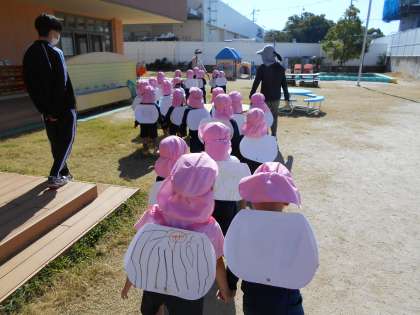 「リュックの中に何を入れていく?」の問いかけに、「お弁当!」「水筒」「お菓子も入れようかな〜」と嬉しそうな子ども達!可愛いリュックを背負って園庭に出かけましたよ♪