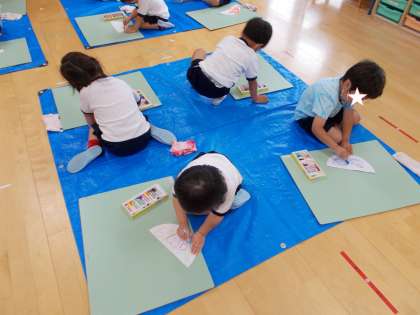 クレパスを使って画用紙で模様を描き、その上から薄く溶いた絵の具を塗ると、クレパスで描いた模様が浮き上がり子ども達はビックリ!!不思議そうに見る子どもや「すごい!」「面白いな〜」と言いながら楽しんでいました。