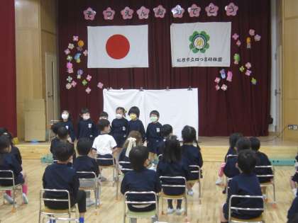すみれ・ひまわり組が、初めて司会係に挑戦!また、大きい組も小さい組も、みんな一緒に楽しめるようクイズも考えました。