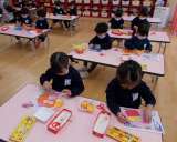 こまの色塗りをしました。(5歳児 ぞう組・きりん組)